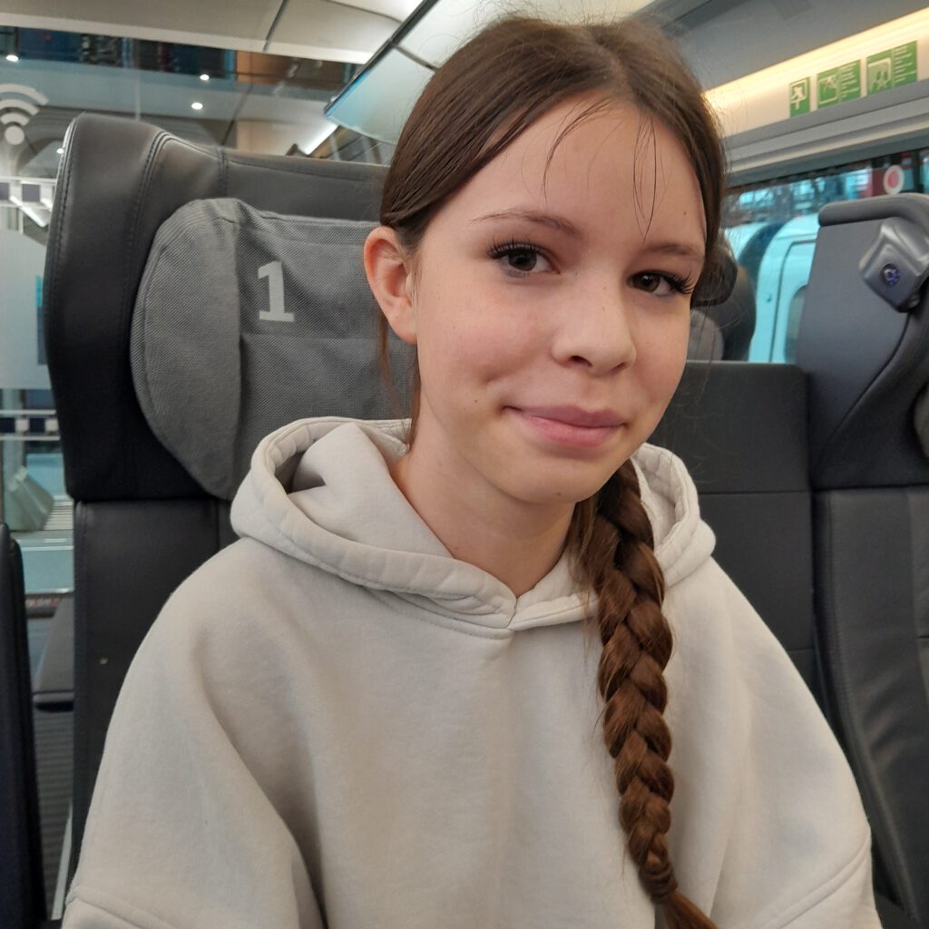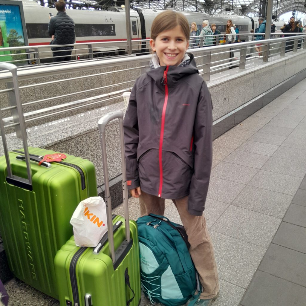 Wir waren so aufgeregt, dass wir viel zu früh mit der Linie 18 zum Kölner Hauptbahnhof fuhren und dort noch eine Stunde auf unsere ICE warten mussten. Dank neuer Preispolitik der DB* (Abschaffung der Familienreservierungen) fuhren wir 1. Klasse, denn das Upgrade inkl. Sitzplatzreservierung war günstiger als die reine Reservierung in der 2. Klasse. Unser von Brüssel kommender ICE hatte einen Personenunfall, doch ein Ersatz-ICE wurde in Köln neu eingesetzt. Ohne Personal, aber das brauchten wir auch nicht bei weniger als einer Stunde Fahrt.