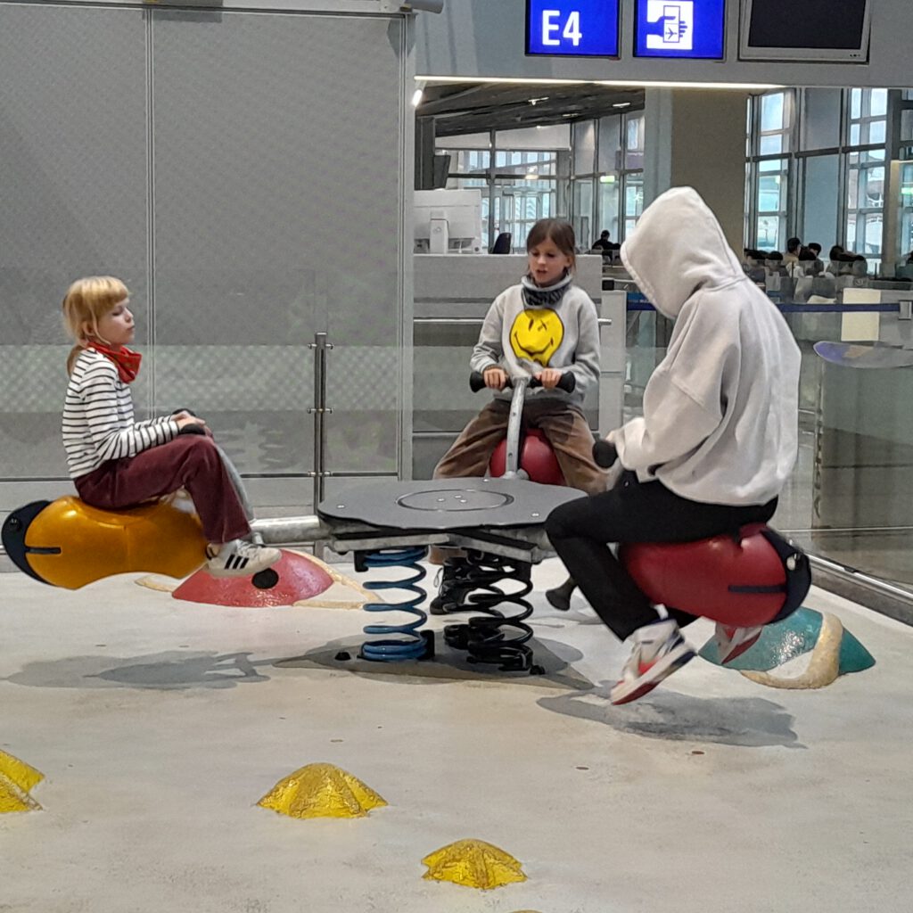 Beim Flug war Aurelias Koffer beschädigt worden, ein Rad war abgebrochen. Egal, der Koffer war schon alt, musste also ab sofort mit drei Rädern auskommen. Draußen wurden wir freundlich begrüßt, lernten zwei andere Familien kennen und wurden in ein Crown Plaza* gebracht. Jede Familie erhielt ein Zimmer, obwohl die anderen beiden keinen Early Check-In gebucht hatten. Das erschien dem Rezeptionisten wohl gerechter, als uns die beiden reservierten (und bezahlten) Zimmer zu überlassen. An Schlaf war nicht zu denken, zu viert auf zwei Betten geht das nicht. Hundemüde wollten wir uns mit der Umgebung vertraut machen, aber außer einem anderen Hotel, der großen Messehalle und vielen Baustellen gab es nichts in Hotelnähe zu sehen. Inzwischen war Frühstückszeit und wir futterten uns durch das üppige Büffet mit vielen warmen Gerichten aus aller Welt.