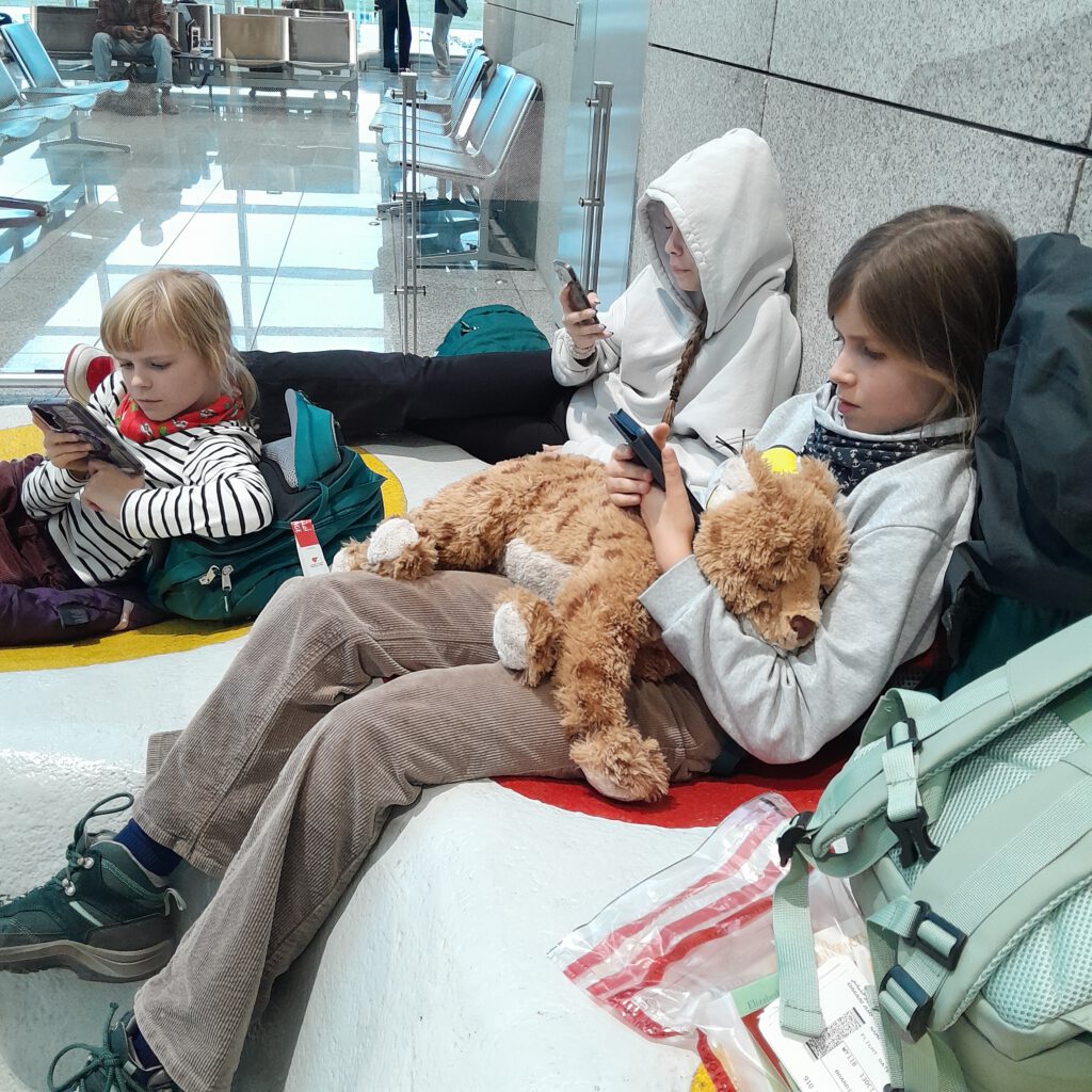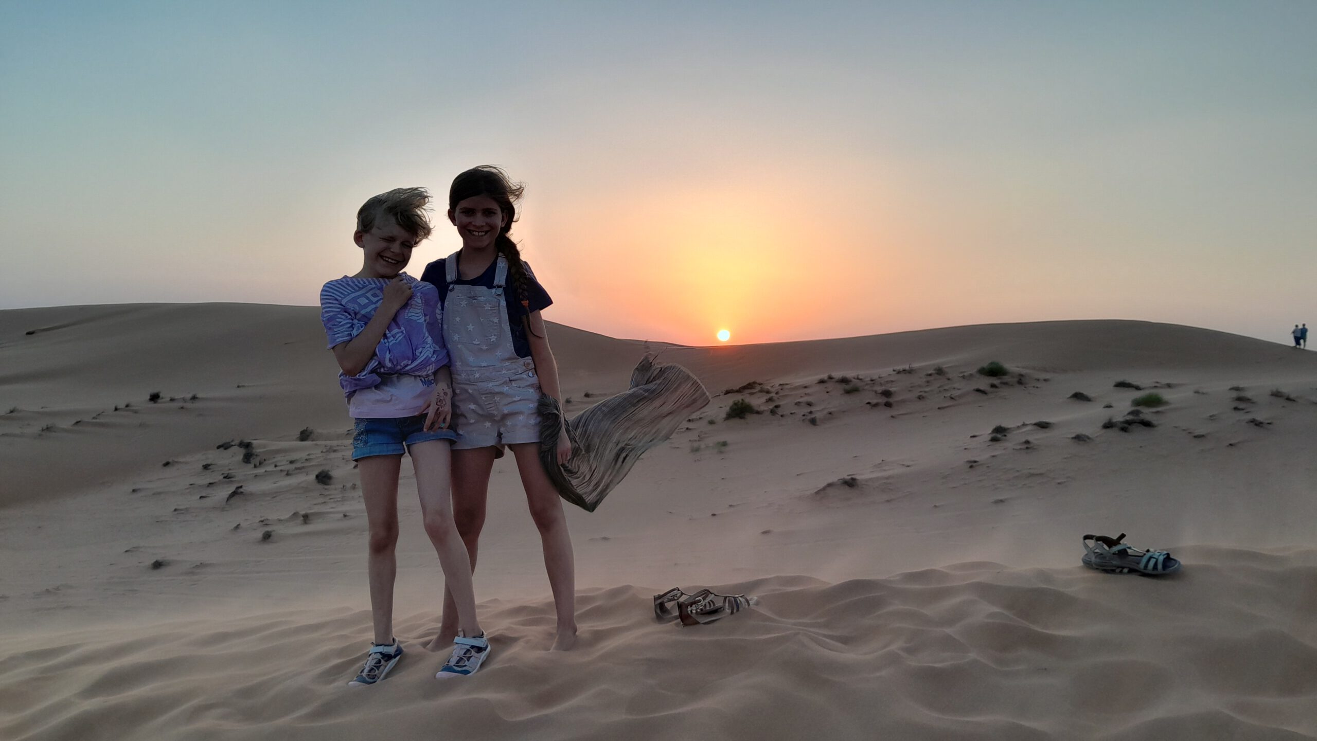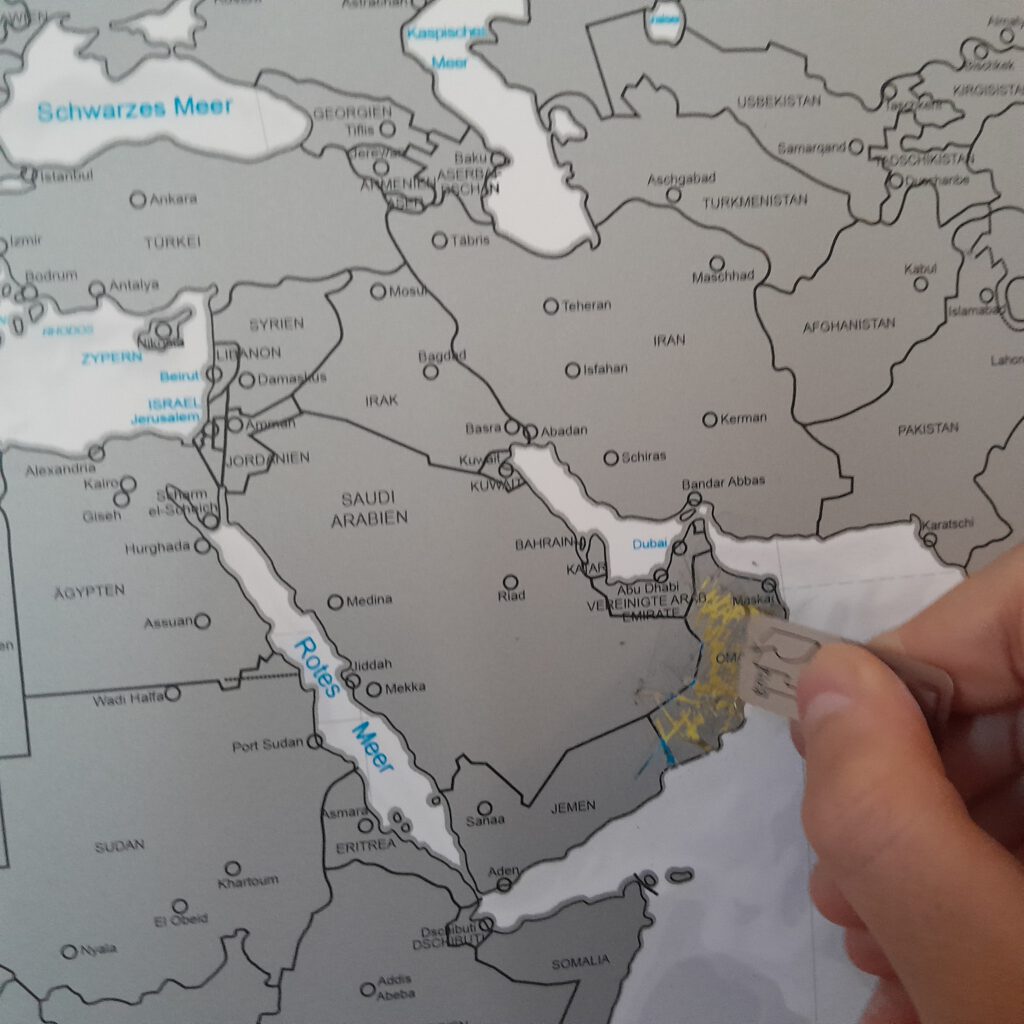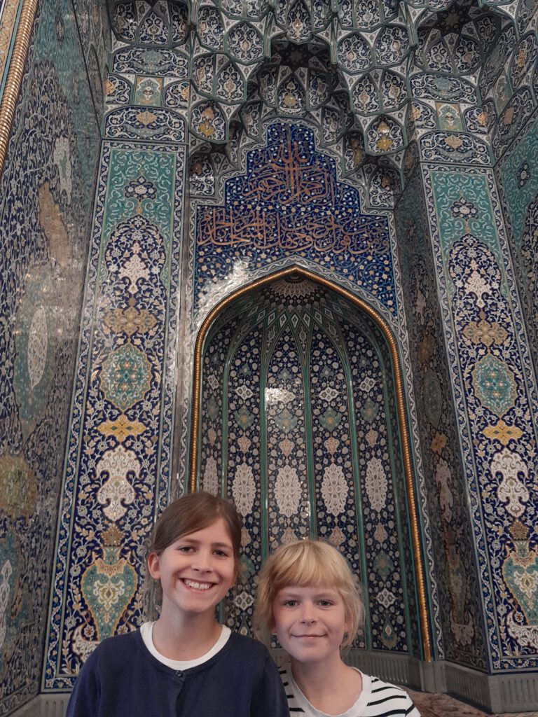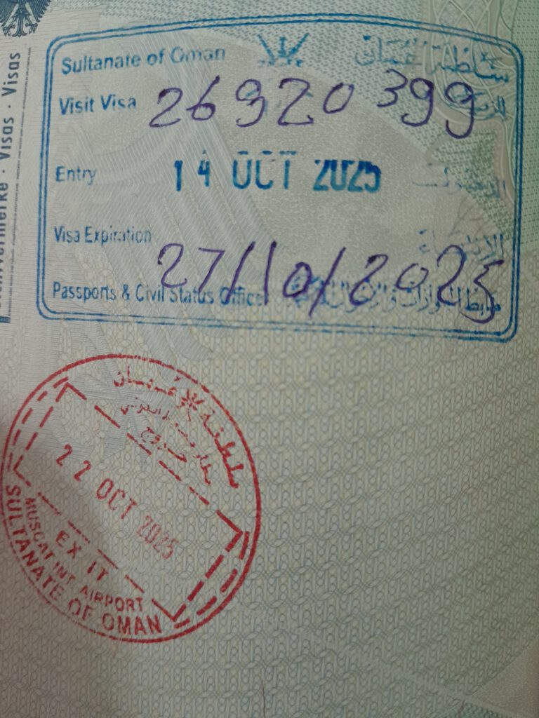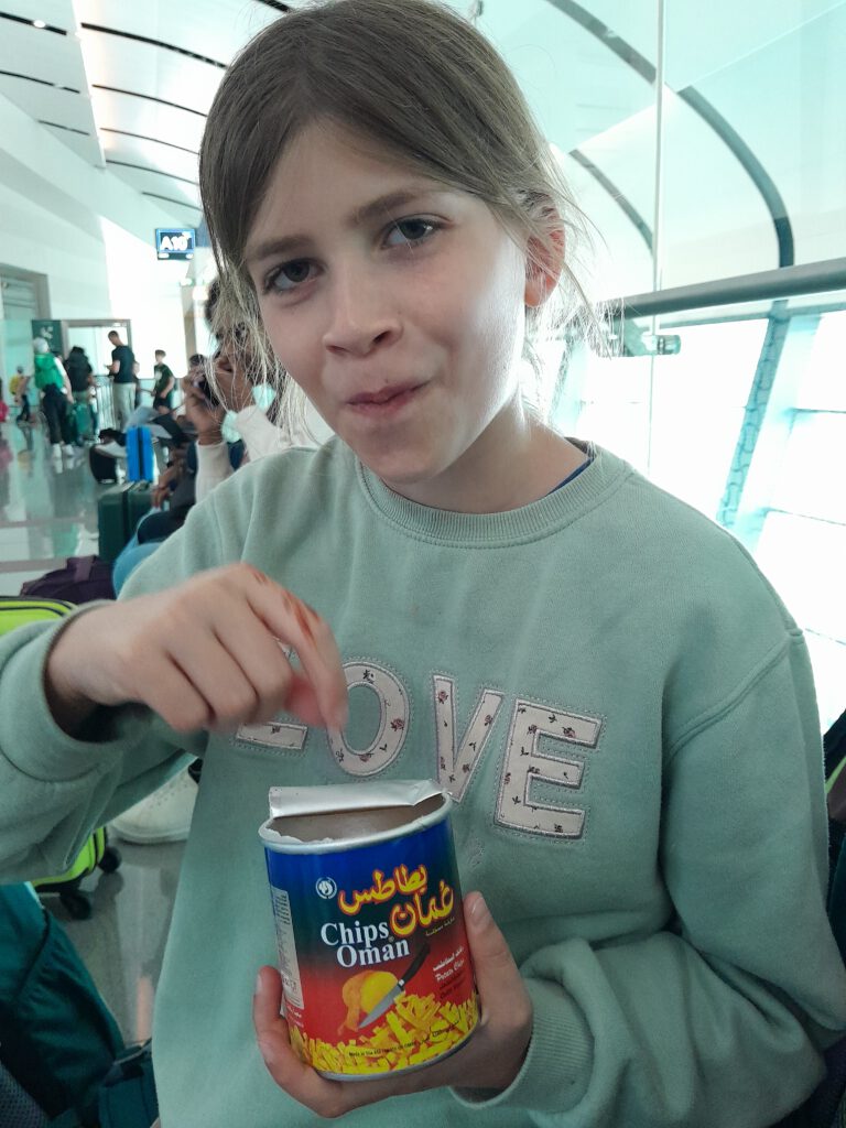 Die Einreise in den Oman war schnell und unkompliziert, bei Aufenthalten unter zwei Wochen gibt es ein Visum on Arrival. Dafür mussten wir einzeln zu den Einreisebeamten, die hochgradig genervt und mürrisch waren, weil der Muezzin schon gerufen hatte, aber noch Leute in der Warteschlange standen. An solchen Situationen wachsen wir alle: Ich musste mein Bedürfnis unterdrücken, zu meinen Kindern zu eilen und sie zu beschützen. Aurelia wagte nicht einmal, den Grenzer mit ihrem (der Pubertät geschuldeten) „Waaaaaas?!“-Gesicht anzusehen. Nele lächelte tapfer, und Cari flüsterte später stolz: „Mama, ich habe innen ganz doll gezittert und geweint, aber das konnte er außen nicht sehen. Ausgetrickst, ha ha!“ Gut gemacht!!!