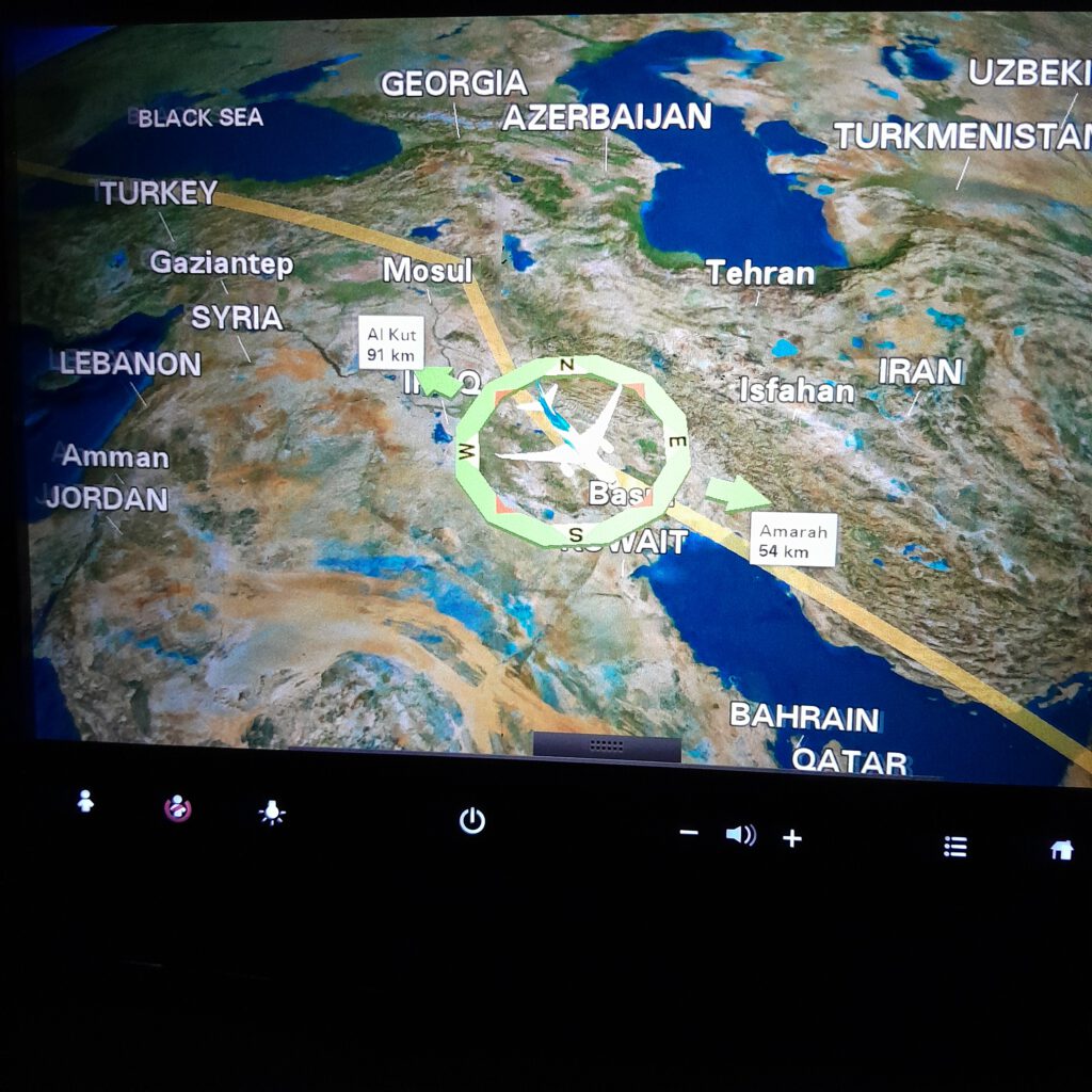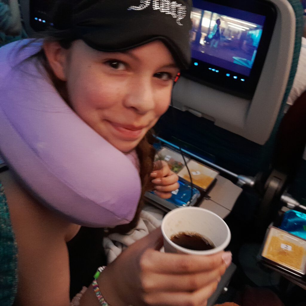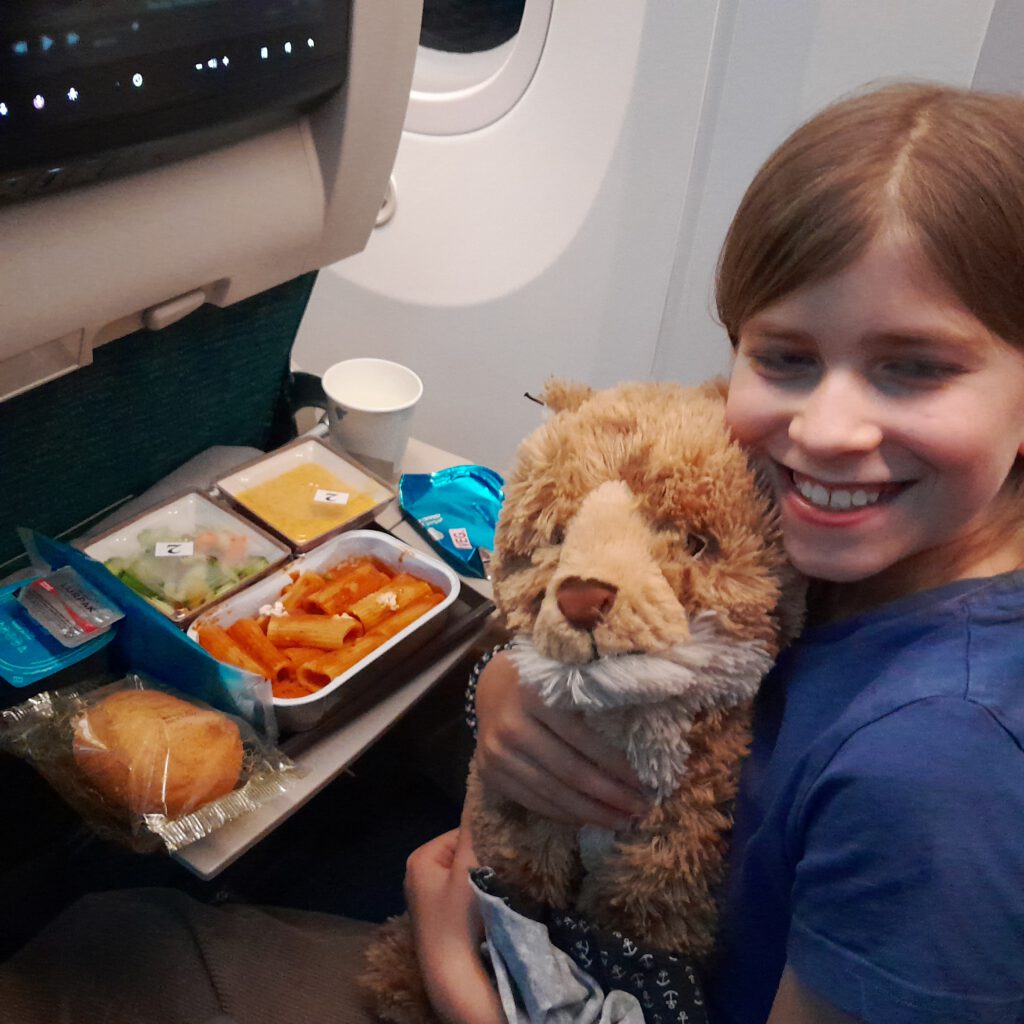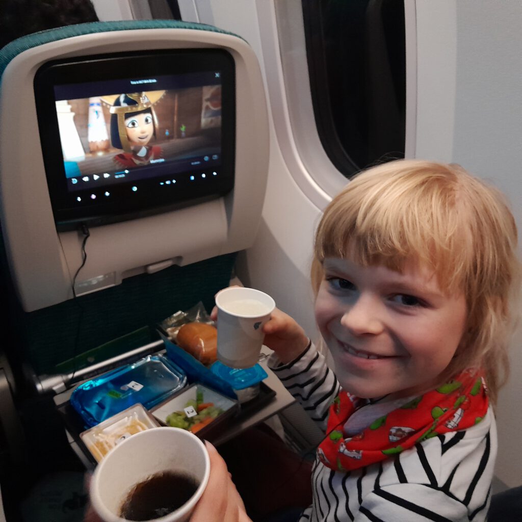 Kleine Schrecksekunde beim Sicherheitscheck: Caris Kartenspiel wurde für Sprengstoff gehalten und die gewissenhaften Sicherheitsbeamten führten bei jeder einzelnen Karte einen Drogen- und Sprengstoff-Scan durch. Unser Nacht-Direktflug mit Oman Air* verlief ohne Probleme, das Boden- und Bordpersonal war hilfsbereit und freundlich, das Essen an Bord köstlich, die Auswahl an Filmen, Musik und Spielen üppig.