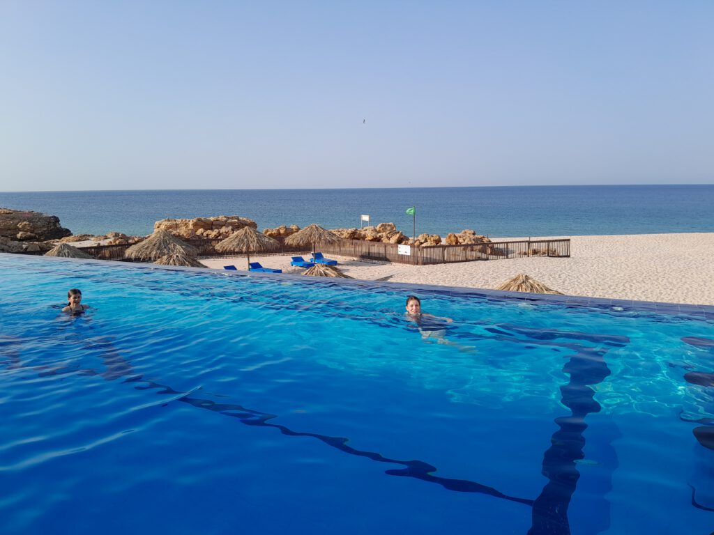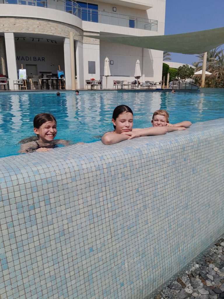 Trotz dieser vielen Erlebnisse kamen wir so früh im Falaj Daris Hotel in Nizwa an, dass wir vor dem Abendessen noch am (und im) Pool entspannen konnten. Das Wasser war grünlich und roch unangenehm, aber die Kinder wollten sich trotzdem darin abkühlen und miteinander toben. Also wurden sie nach dem Bad gründlich geduscht und nahmen das leichte Jucken der Kopfhaut und des ganzen Körpers lässig hin.