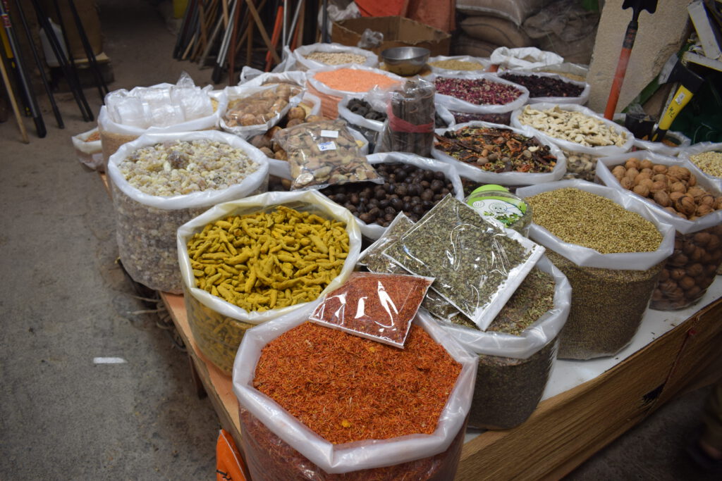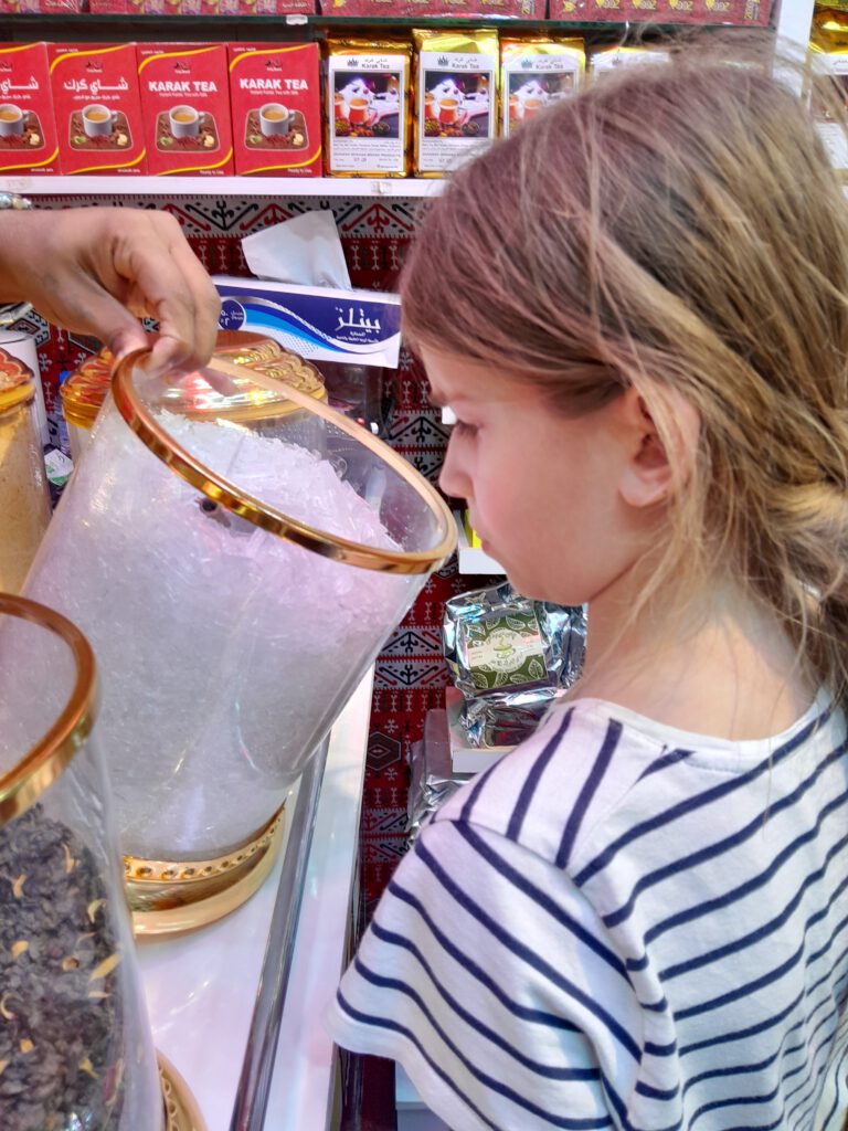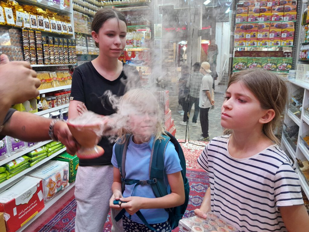Am späten Nachmittag zeigte uns Mustafa die architektonischen Highlights von Muskat. Ich mag das Opernhaus, die Kinder waren mehr beeindruckt von dem blau-weiß-goldenen Sultanspalast. Auf dem Weg zurück zum Hotel gab es noch einen Halt an der Hafenpromenade, um den Mutrah-Souk. Wer’s mag, kann hier mit den Händlern um Gewürze, Düfte, Weihrauch, Tücher, Deko, Andenken und ganz, ganz viel billigen China-Tinnef feilschen. Für uns war es nicht das Richtige: Cari und Aurelia fühlten sich von den aufdringlichen Händlern (optisch eher Ostasiaten/Inder als Omani) belästigt und hatten Fluchttendenzen. Erst ein ruhiger omanischer Gewürzhändler rettete die Szene: Er lud uns in seinen kleinen Laden ein, wir durften ohne Belästigung ansehen, anfassen, riechen und probieren.