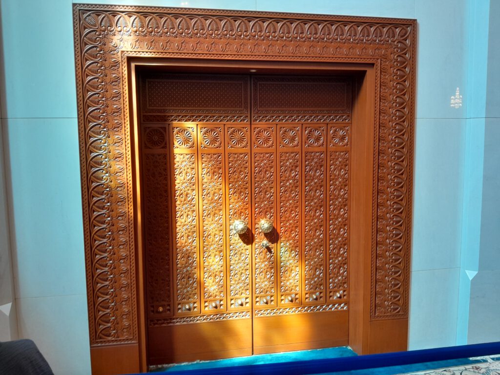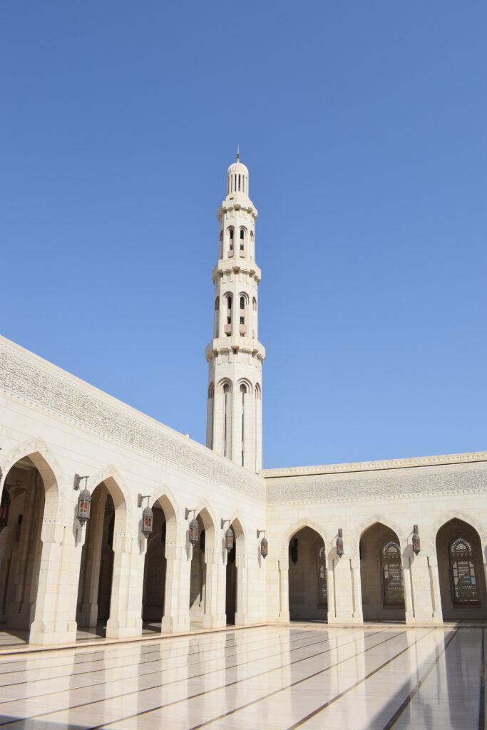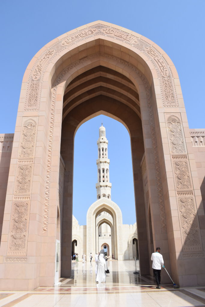 Die Große Moschee, wie die Sultan Qaboos Grand Moschee von Muskat von den Einheimischen genannt wird, ist einer der prächtigsten Sakralbauten, die ich je gesehen habe. Die fünf Minarette mahnen an die fünf Pfeiler des Islam, alle Zahlen und Maße sind Superlative, z.B. finden in der großen Gebetshalle 6600 Gläubige Platz. Beim Anblick des riesigen Kronleuchters aus Swarovsky Kristallen, den edlen persischen Teppichen und den Wänden aus feinstem Carrara-Marmor waren wir geradezu überwältigt. Wir hatten uns alle korrekt gekleidet und die Schuhe in den Regalen am Eingang abgestellt, so durften wir jeden Bereich der Moschee betreten, sogar die Räume für die religiösen Waschungen und die Bibliothek.
