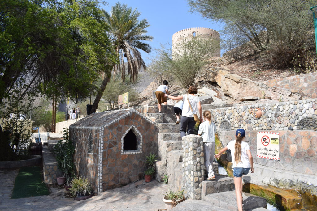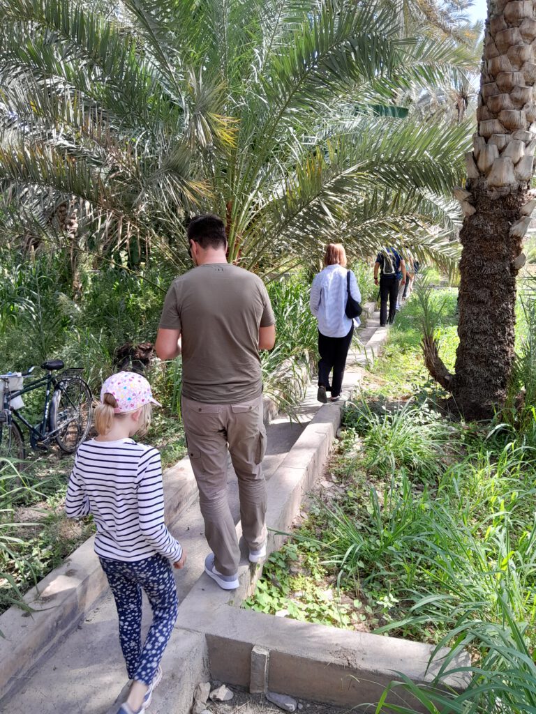 Die Stadt Al Hamra mit den alten Häusern aus Lehm ist ein echter Kontrapunkt zu den modernen Bauten in Muskat und Nizwa. Der rötliche Farbton des Lehms ist Namensgeber, den Ahmar steht für Rot. Im Wohnhaus des letzten Imam von Al Hamra ist ein Wohn- und Kulturmuseum untergebracht. Bei der kurzweiligen Führung durch das liebevoll eingerichtete Museum erfuhren wir, wie Dattelsirup aus getrockneten Datteln gewonnen wird. Spannend: er dient nur etwa zwei Jahre als Lebensmittel und wird danach dann zum Anstreichen genutzt. Ein Mädchen leitete unsere Kinder an einer Getreidemühle an, einige Frauen zeigten uns das Mahlen von Kaffee und die Herstellung einer Sandelholzpaste, die vor Sonne schützt. Sie kleideten uns in typisch omanische Tunikas und Tücher, zum Abschluss gab es Omani-Kaffee und Datteln für alle.