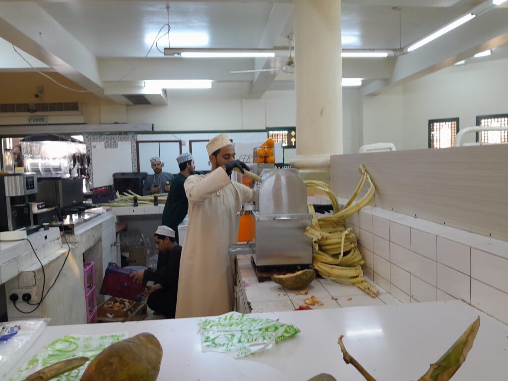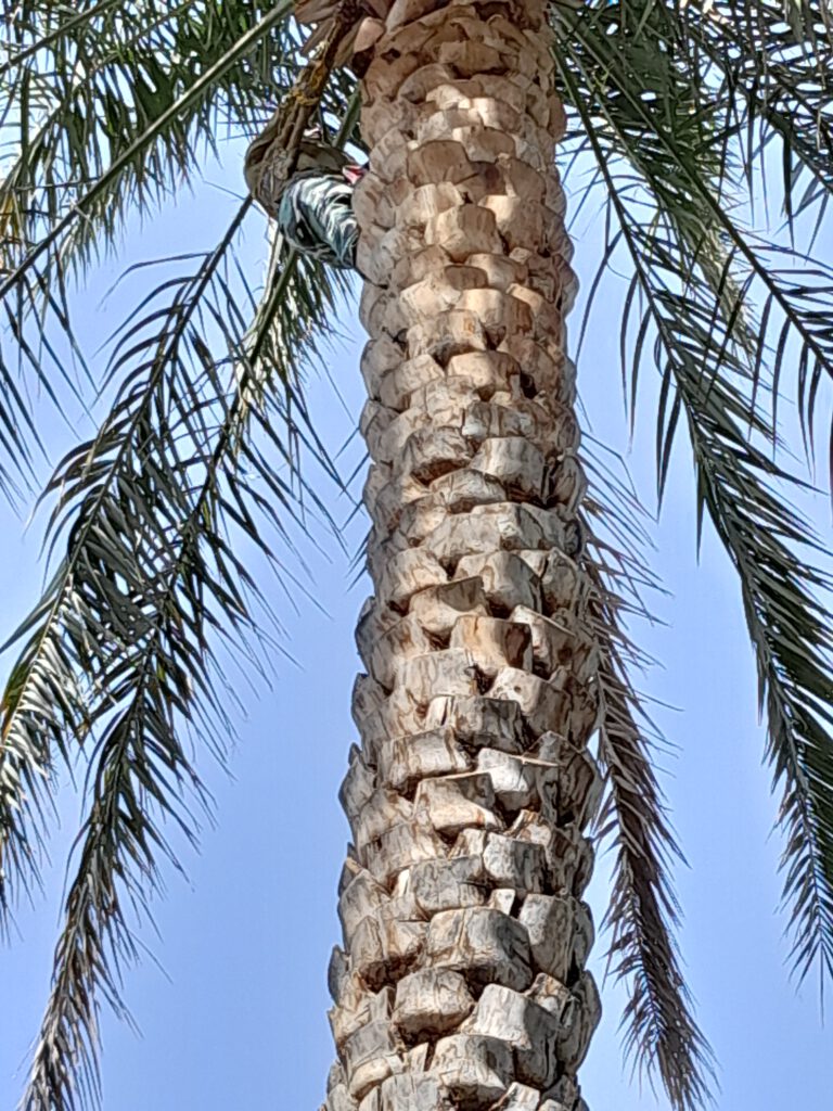 Auf dem Weg nach Nizwa machten wir Halt in der Oase Birkat al Mouz. Dieser Name lässt eher auf Bananen schließen, wir sahen auch einige wenige Bananenstauden, doch vorwiegend werden dort Datteln angebaut. Dort zeigte uns ein Arbeiter, wie er barfuß eine Dattelpalme hinauf klettert – leider durften die Kinder es nicht selbst ausprobieren, so sehr sie es sich auch wünschten. Im Anschluss gab es eine neue Variante des inzwischen lieb gewonnenen Standardgerichts Huhn & Reis. Beim Dessert konnten die Datteln punkten – obschon ebenfalls getrocknet, waren sie viel aromatischer als alle, die wir in Deutschland kaufen können. Dazu genossen die Erwachsenen den typischen omanischen Kaffee, der relativ dünn ist und mit Kardamom gewürzt wird.