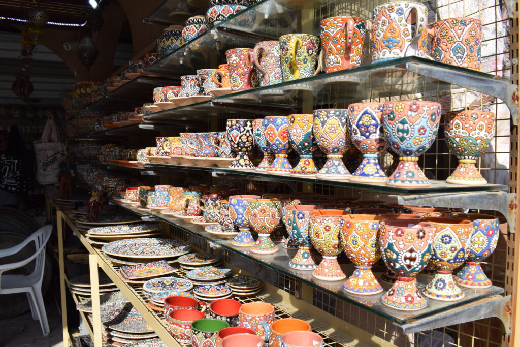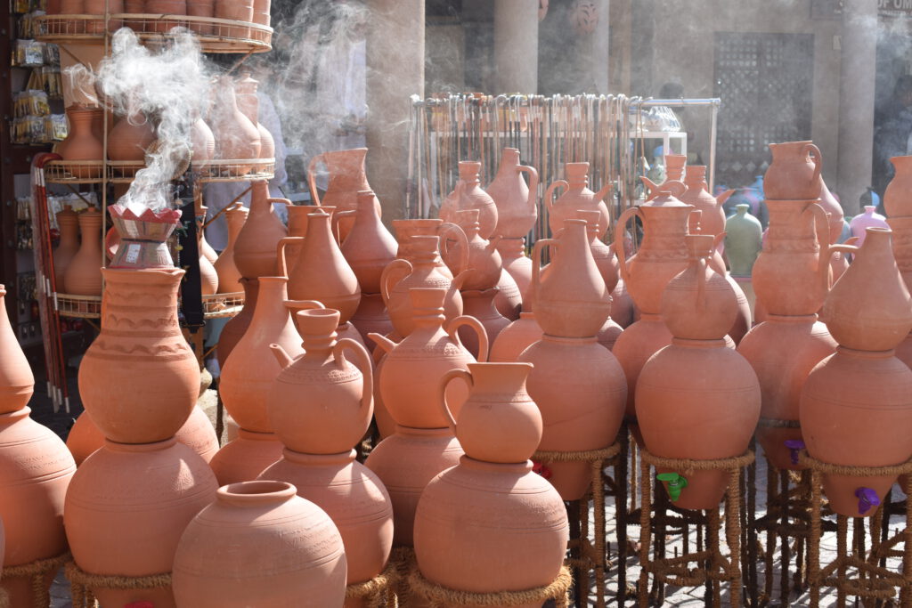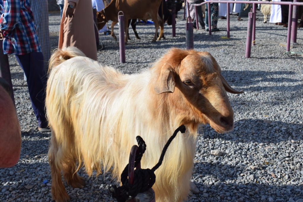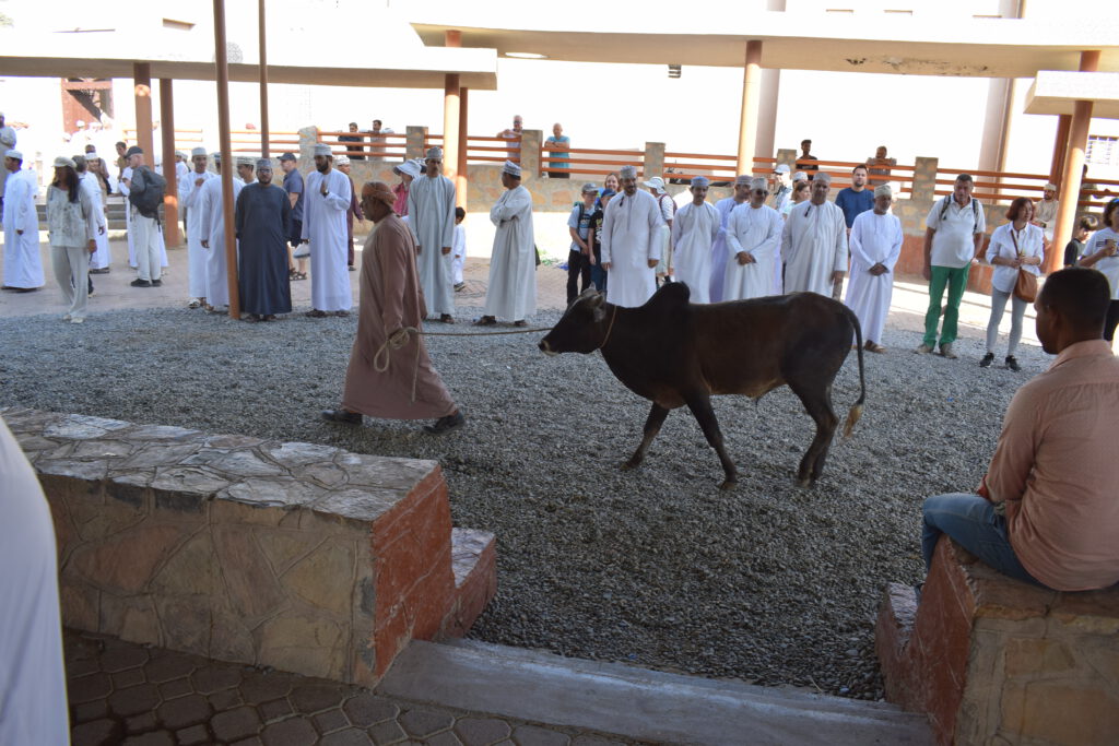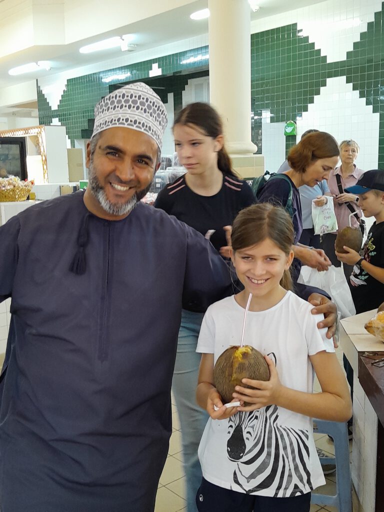 Der nächste Tag war vollgesteckt mit Kultur: Wir starteten früh, um das lebhafte Treiben auf dem Viehmarkt zu beobachten. Die Anpreisungen der Verkäufer, das Gefeilsche und die muhenden, blökenden und meckernden Kühe, Schafe und Ziegen ängstigten Cari. Sofort war unser Guide Mustafa zur Stelle und nahm sie mit zum äußersten Rand des Marktes. Im Anschluss schlenderten wir über die anderen Märkte und begegneten vielen Einheimischen in Festtagskleidung, denn am freien Freitag geht die ganze Familie auf Einkaufsbummel. Wir probierten (und kauften) Datteln, Halwa, Datteldirup, Kokosnüsse, frisch gepressten Zuckerrohrsaft, getrocknete Grapefruit, Ingwer, Mango und Kiwi. Halwa ist nicht etwa ein Wikinger-Vorname, sondern die nationale Süßspeise: zuckersüß und klebrig, mit Safran, Kardamom und Rosenwasser abgeschmeckt, manchmal auch mit Nüssen, Mandeln und Trockenfrüchten. Sogar ein Päckchen Weihrauch wanderte in unsere Einkaufstüte – und natürlich noch eine Portion der essbaren Steine aus Kamelmilchschokolade. Auch Lavendel- und Weihrauchwasser haben wir gekauft – doch bisher fehlte uns der Mut, es auch zu trinken.