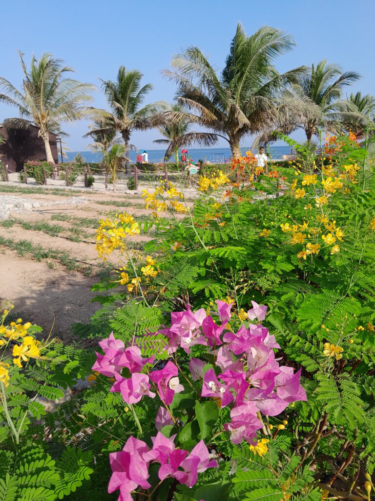Im Hotel blieb viel Zeit für den Pool, den Strand, das Meer und den Basketballkorb. Nach dem Abendessen fuhren wir zum Naturschutzgebiet am Schildkrötenstrand in Raz-al-Jinz. Wir hatten das Glück, ein frisch geschlüpftes Schildkrötenbaby in das von Leuchtalgen bläulich-weiß glitzernde Wasser trippeln zu sehen und einer etwa 50 Jahre alten Schildkröte nach der Eiablage beim Graben zusehen zu können. Sooooo süß! Leider entdeckte Cari im Strahl ihrer Rotlichtlampe dann aber auch eine kleine Schildkröte, die es nicht geschafft hatte. Sie lag da ohne Kopf, der Natureguide erklärte anhand der weiteren Spuren, dass ihr wohl ein Krebs den Kopf abgebissen haben musste.