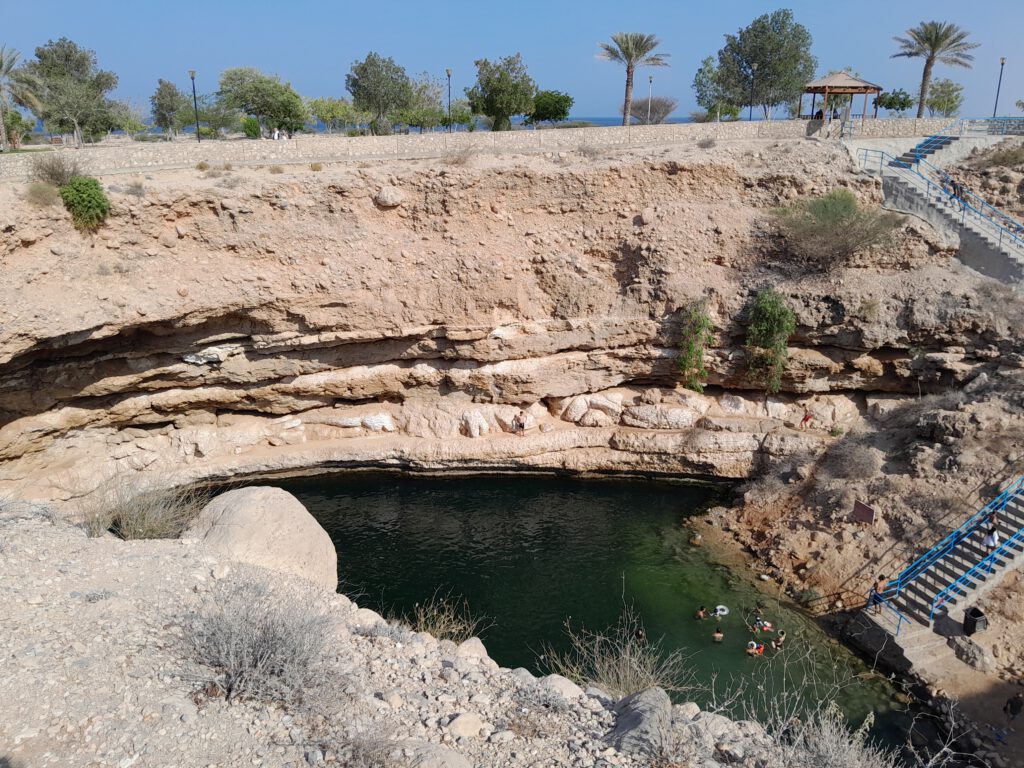Hungrig kehrten wir zum Bus zurück und genossen das letzte gemeinsame Essen mit Mustafa und Said in einem nahegelegenen Hotel. Den Abschluss bildete Hawiyyat Nadschm, auch Bimmah Sinkhole genannt, das sich in einem Park wie aus dem Nichts auftut. Der arabische Name bedeutet Sternschnuppe und es wird gesagt, dass es bei einem Meteoriteneinschlag entstanden sei, andere behaupten sogar, es sei durch den Einschlag eines Stückes vom Mond entstanden. Eine örtliche Legende erzählt, dort sei das Haus der Dämonen, weshalb es auch Bait al Afreet genannt wird. Fakt ist wohl eher, dass dies eine Höhle war, die eingestürzt ist. Das Höhlensystem ist unter der Wasserlinie mit dem Meer verbunden und erfahren Höhlentaucher können in 60 m Tiefe tatsächlich bis zum Meer tauchen. Die Legende war für die Reisegruppe spannender als das Loch selbst – wir alle waren müde und konnten nichts neues mehr aufnehmen.