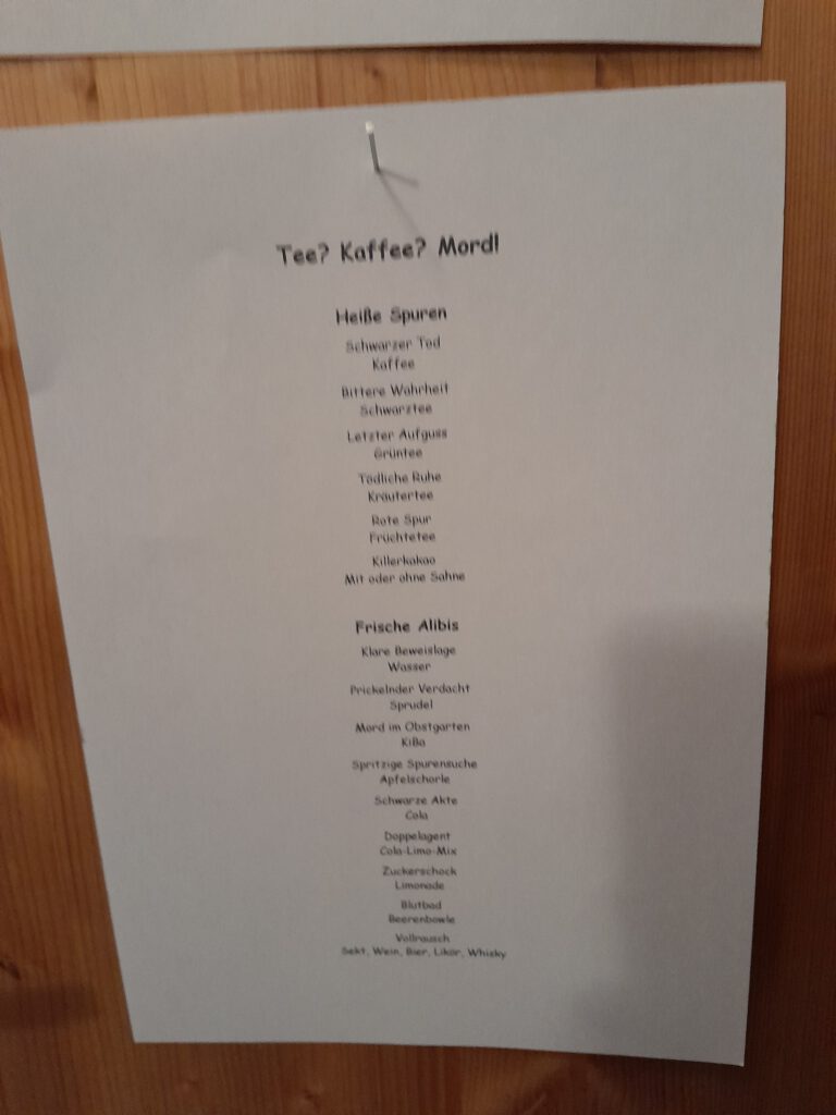 Für vier von uns war es das allererste Krimidinner überhaupt, für drei das zweite Mal. Erwähnenswert ist vielleicht noch, dass Aurelia mit ihren 14 Jahren deutlich jünger ist als die empfohlene Altersfreigabe ab 16. Das Spiel stellte für sie jedoch keinerlei Problem dar – weder inhaltlich noch vom Rollenverständnis her. Sie war von Anfang an voll im Spiel, brachte sich aktiv ein und hatte ebenso viel Freude an den Ermittlungen wie alle anderen.
